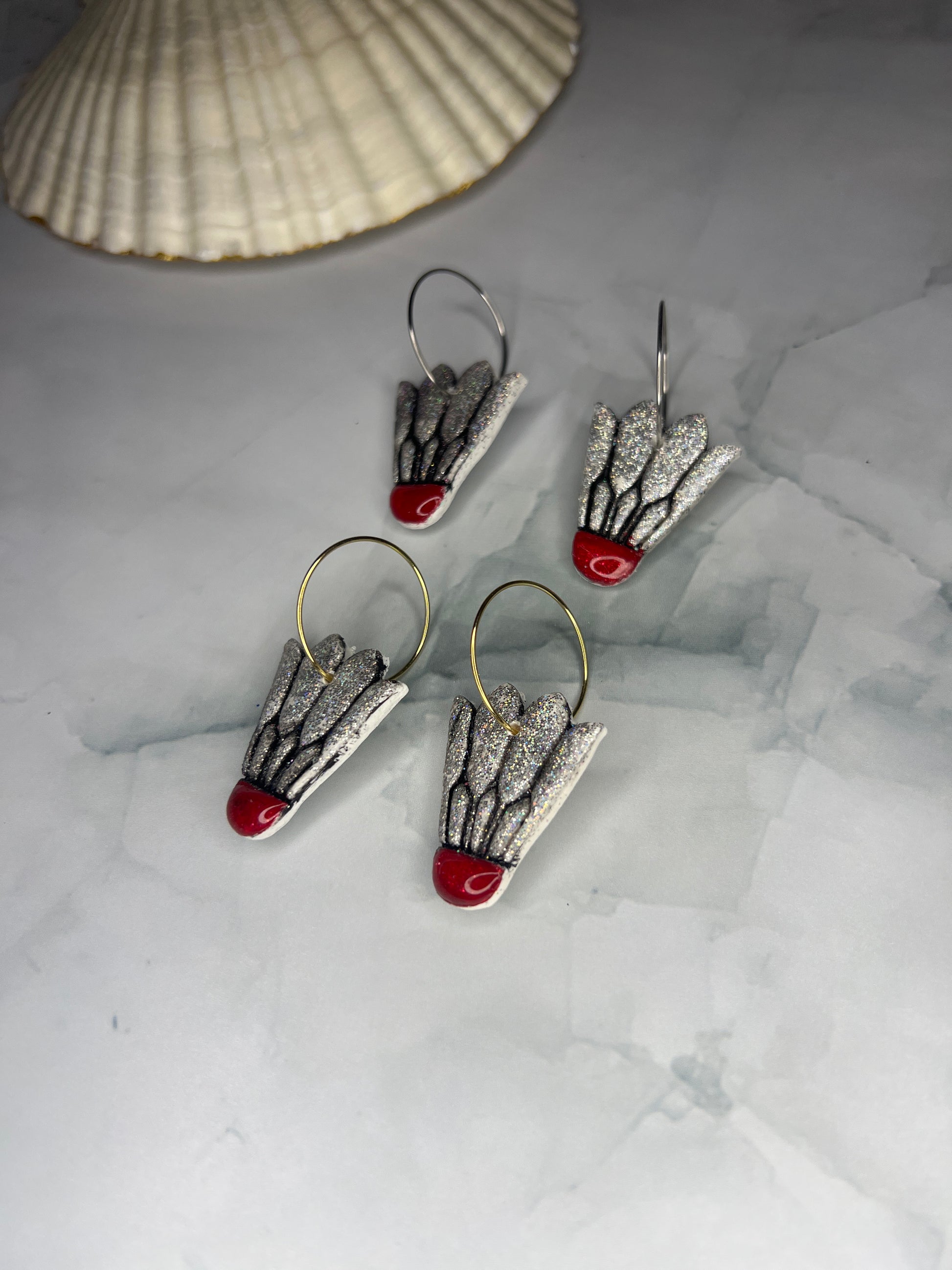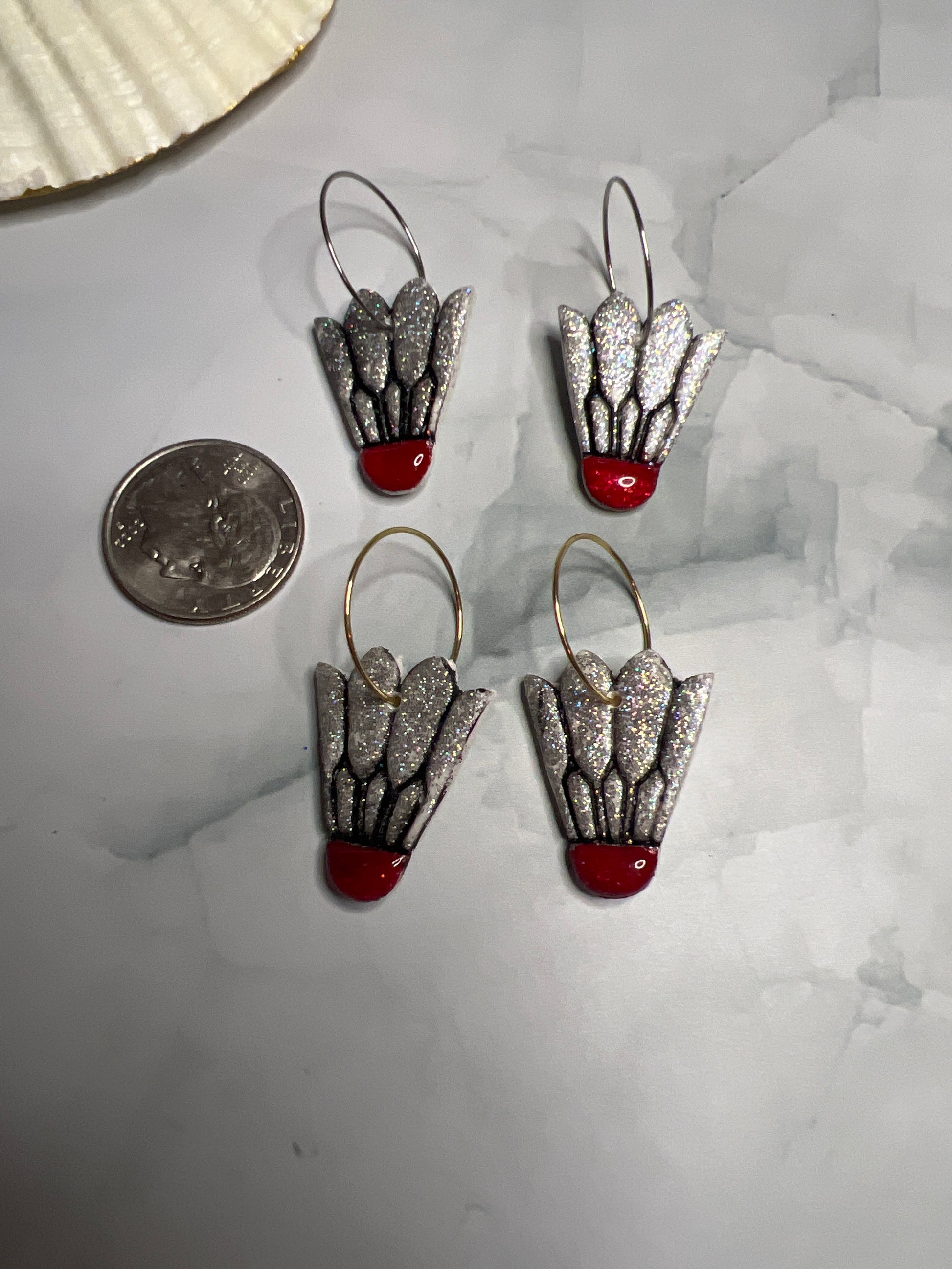 Serve up some sporty sparkle with these handmade badminton-inspired hoop earrings! Crafted from polymer clay and individually hand-painted, each shuttle design features detailed feather textures and a bold pop of red at the base. A layer of sealed glitter adds the perfect shimmer while keeping the design protected and long-lasting.
