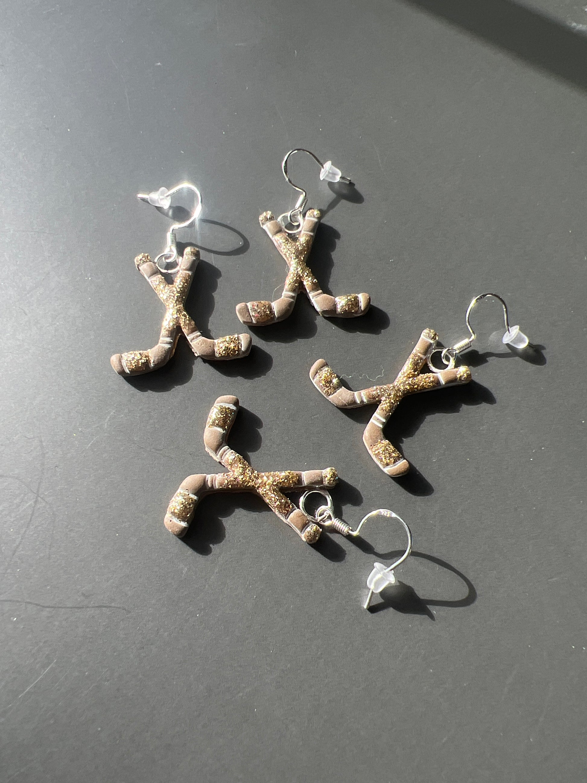 Score major style points with these adorable handmade, hand-painted hockey stick earrings! Each pair is crafted from polymer clay, featuring individually detailed sticks accented with eye-catching glitter that brings the perfect touch of sparkle.