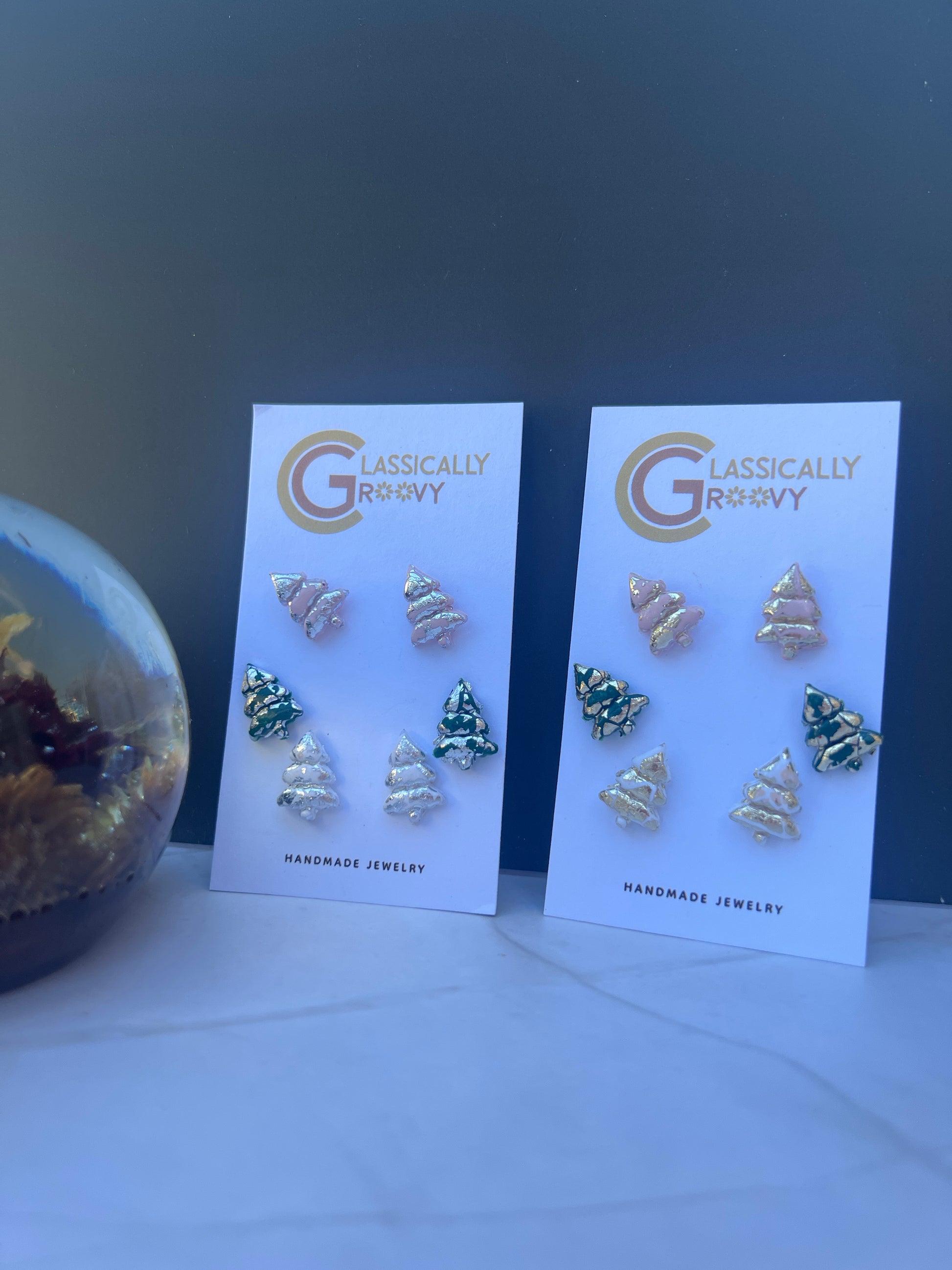 Add a festive sparkle to your holiday season with these handcrafted polymer clay Christmas tree studs! Each set includes three pairs of adorable mini trees in green, white, and pink, all finished with a metallic shimmer that catches the light beautifully. Whether you’re dressing up for a holiday party or adding a little seasonal joy to your everyday style, these studs make the perfect cheerful touch.