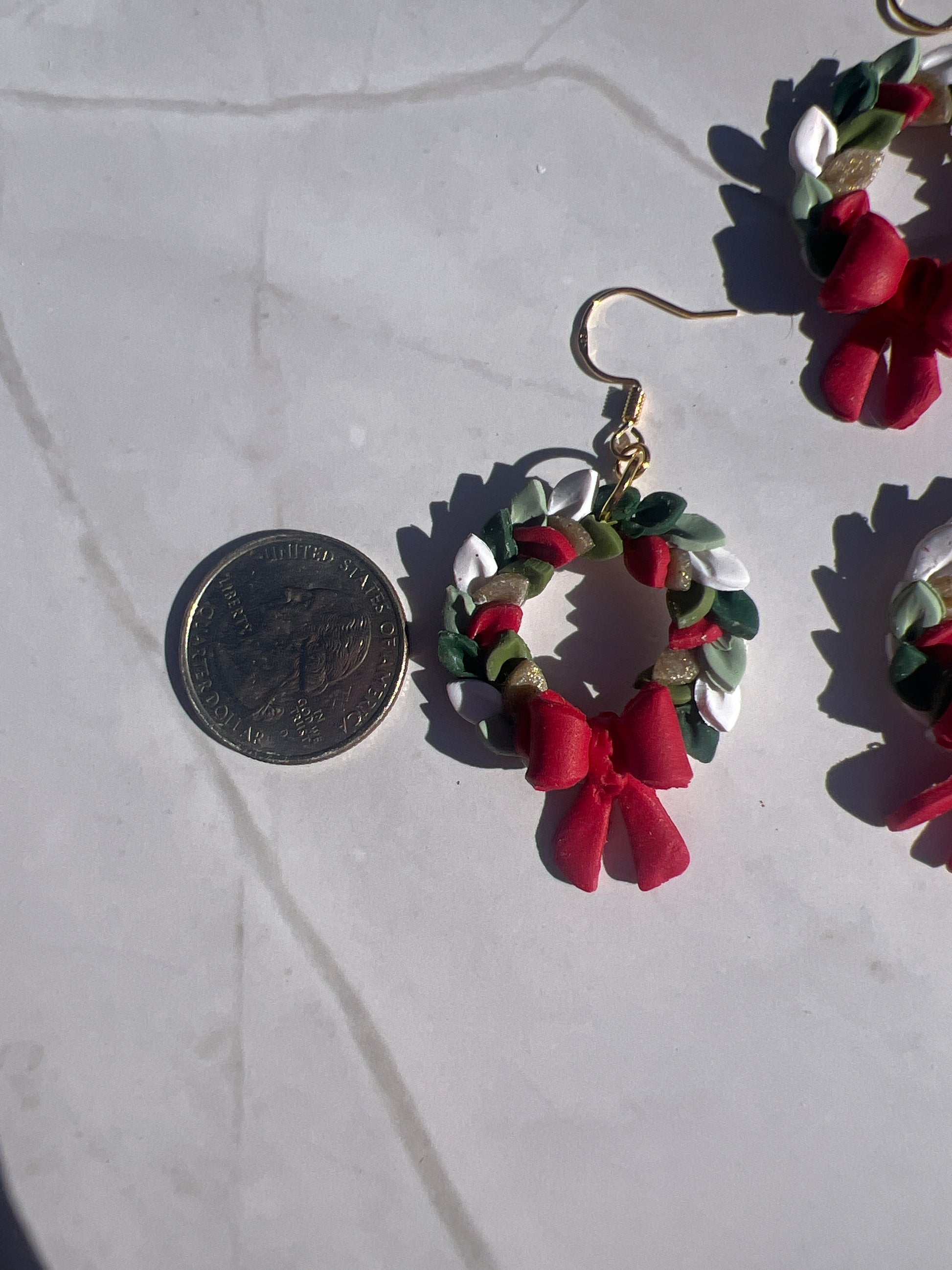 Add a festive touch to your holiday look with these handmade polymer clay wreath earrings. Each pair is uniquely crafted, featuring individually sculpted and carefully placed leaves in shades of deep green, soft sage, crisp white, and shimmering gold. A bright red bow completes the cheerful design, giving each earring a classic Christmas charm.